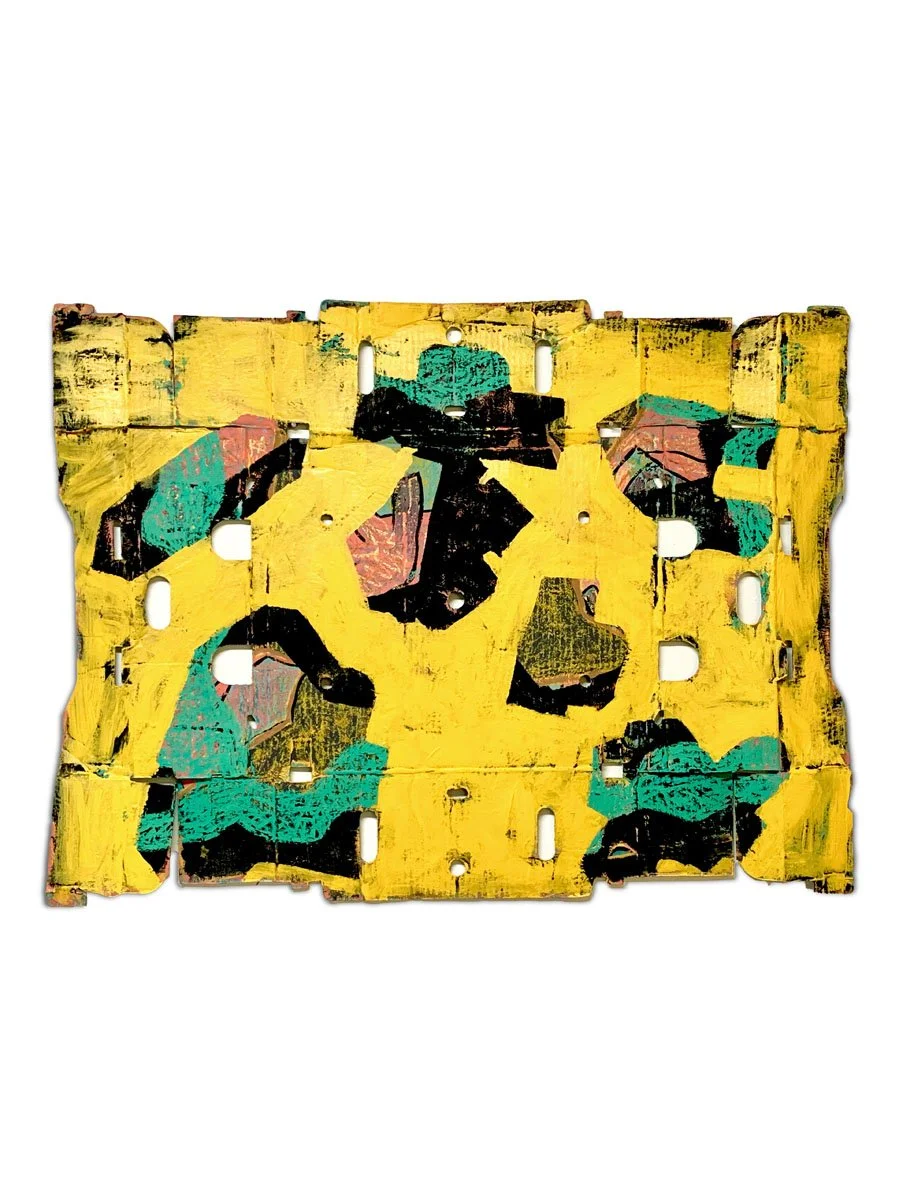 In Hayes’ larger works, flattened cardboard boxes provide both outline and surface on which to paint. It is here that the primacy of materials in Hayes’ work is most viscerally felt. The shapes of these discarded boxes, with their crushed and bent edges, suggest something “digital”. The perforations in these surfaces—a pattern of holes, for example, or cutout handles in produce boxes, gently curved to match the angle of a hand —are hugely important for the artist, who sees them as “a kind of code.” They are a visual punctuation against fields of distinct forms and color, and a dimensional disruption of the figure-ground relationship.