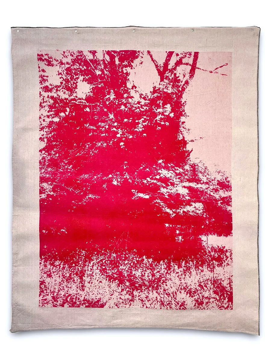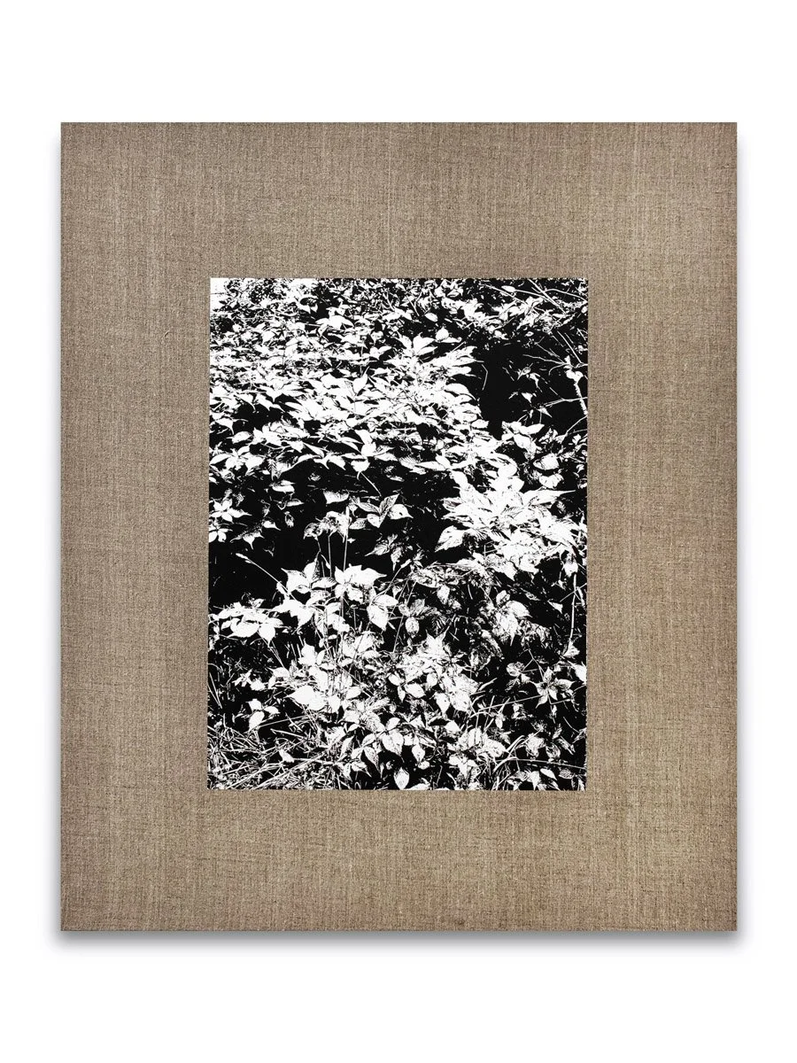 In this series, Stroup photographs this terrain with a simple cell phone and maximizes the image contrast, ultimately producing unique silkscreens of solely black and white pigment on stretched linen. While photographs, these unique works begin to take on the quality of paintings. Floating in the stretched canvas of natural fabric are blindingly crisp, sun-drenched vistas and details of this indeterminate landscape on the city’s edge. Large-scale versions of these images are made by returning to a photographic process, using light-sensitive screen emulsion on loose linen, sometimes magenta and sometimes blue. Unlike the sharply printed silkscreens, these photographs exposed on fabric allow for the process and material to take a hand in their final state.
