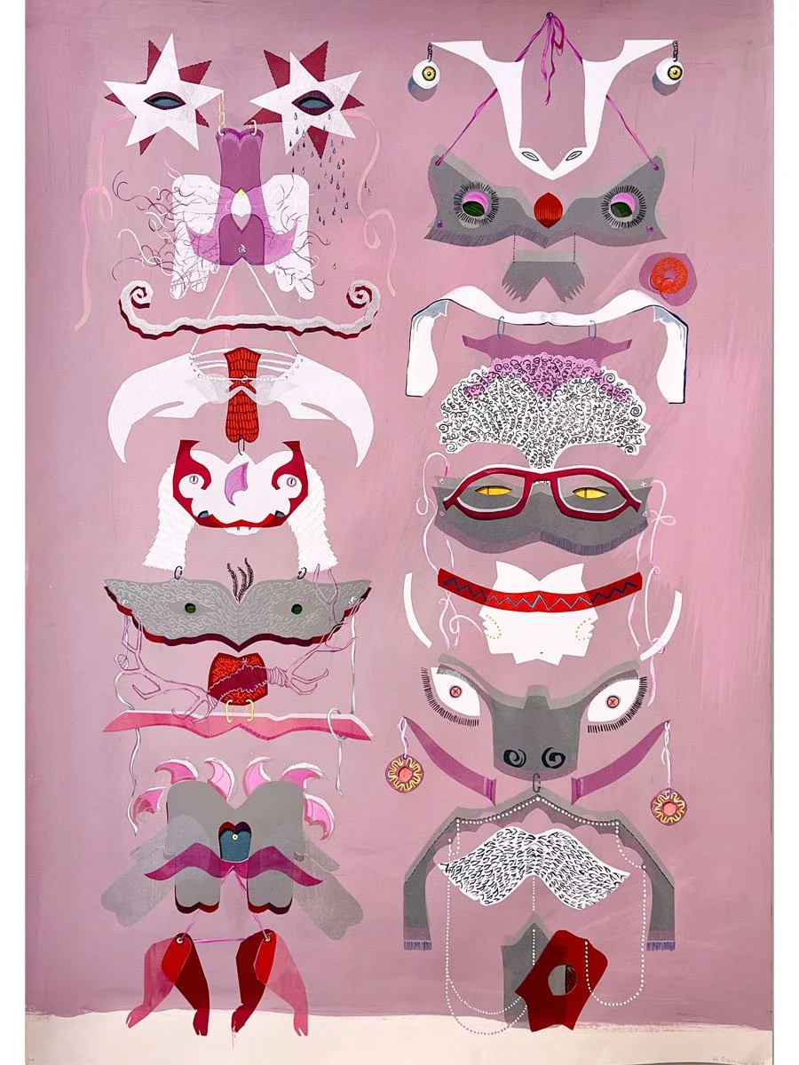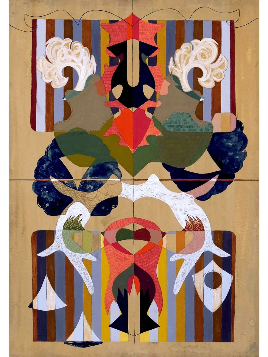 Trained in textile design, Helen Quinn deploys a combination of screen printing, gouache, watercolor, pastels and ink on paper to create compositions of symmetrically stacked and overlapping curvilinear shapes. The Circus Rorschach series began as portraits of different stops on the 7 train in Queens but, for Quinn, has developed into something different. These paintings, meticulously constructed abstractions, allow for an articulation of memory and perceptions of fleeting moments: colorful phantoms of her daily commute. Having left a more representational approach behind, they have acquired the feel of modern illuminated manuscripts: ciphers of a time, place and people assembling and disassembling from view.