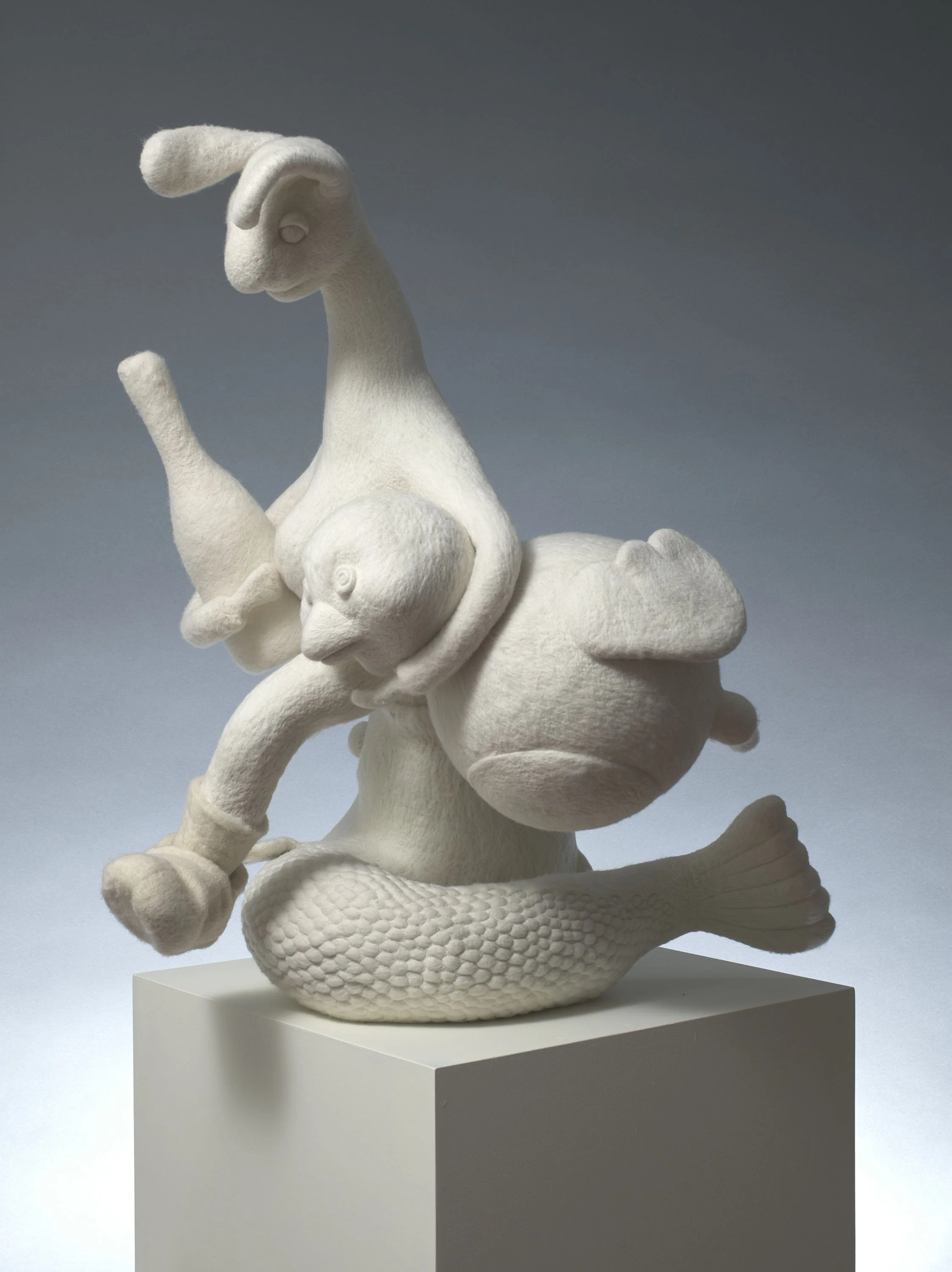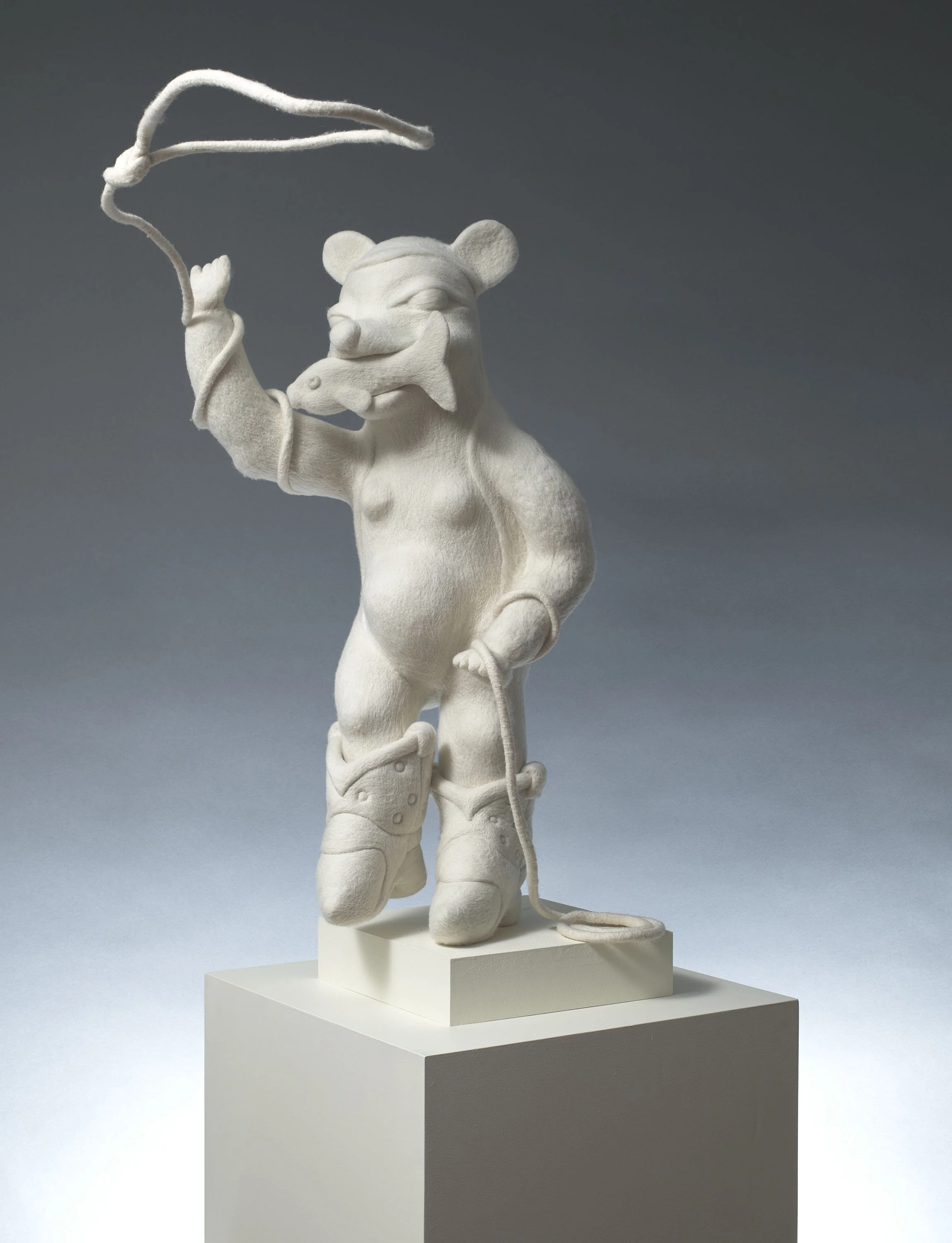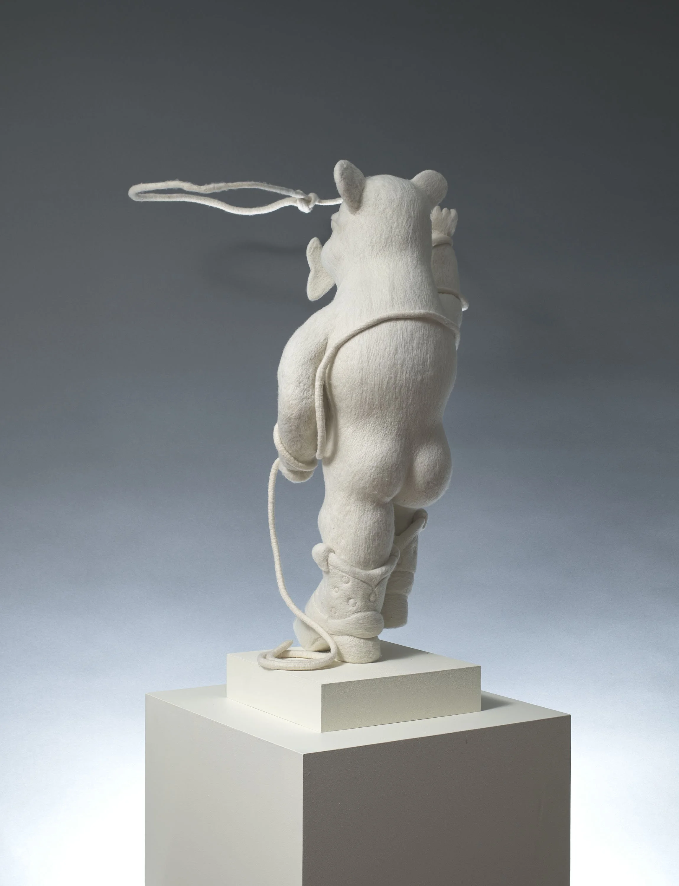 For Latislaw, each figure informs the following one in a slow process of “neurotic story-building.” The concrete details of the narrative are not as important to the artist, however, as the formal and creative possibilities each part of the sequence affords—each arrangement allowing for new associations and imagining. Despite their child-like appearance, each sculpture is meticulously crafted; curved and flowing details revisited and perfected. With their off-white hue perched atop white pedestals, the sculptures allude to traditional marble statuary but are composed of wool—a soft material with working class and craft associations.