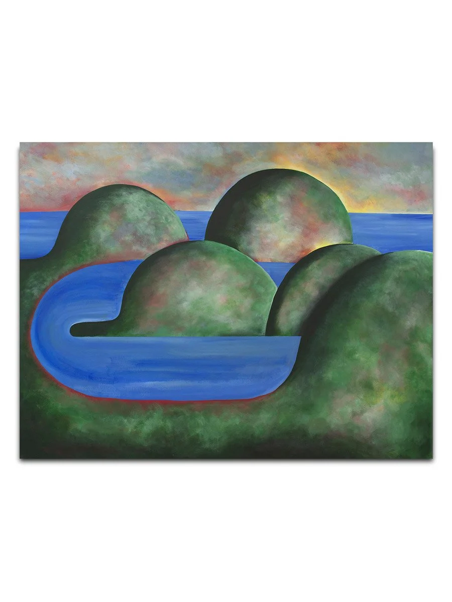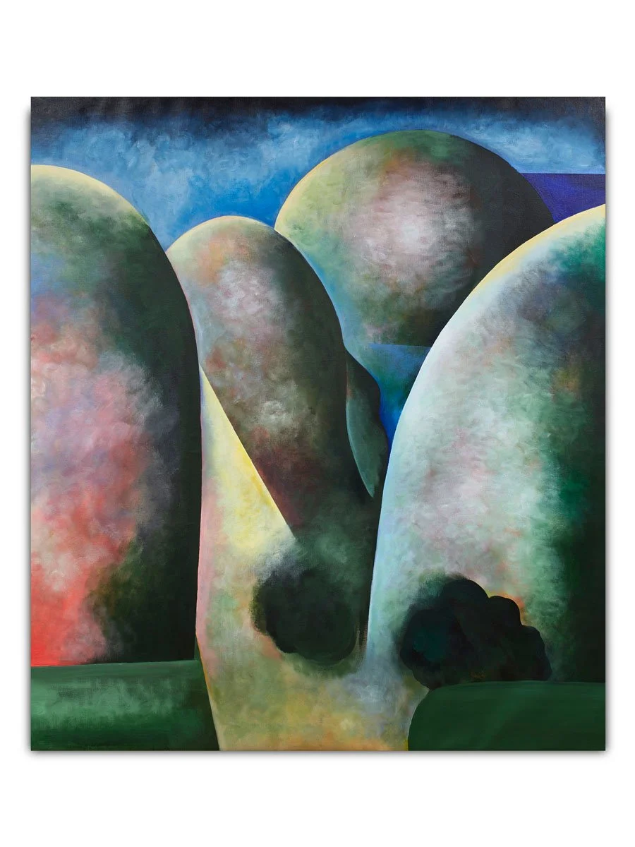 The artist’s landscape paintings are made in tandem with the sculptures. Similarly infused with dream-like curving shapes, for Latislaw, the paintings have become a backdrop to this afflicted stage set. Painted in acrylic on canvas, the paintings share the pillowy forms of the sculptures, working as an insistent fantasy of actual nature. The idea of an unadulterated landscape as a clean slate—a place for narrative yet to be placed—is a point of fascination for the artist. Together, the sculptures and paintings create an entire picture, character and environment, for a world that is at once humorous and brimming with mischievous potential.
