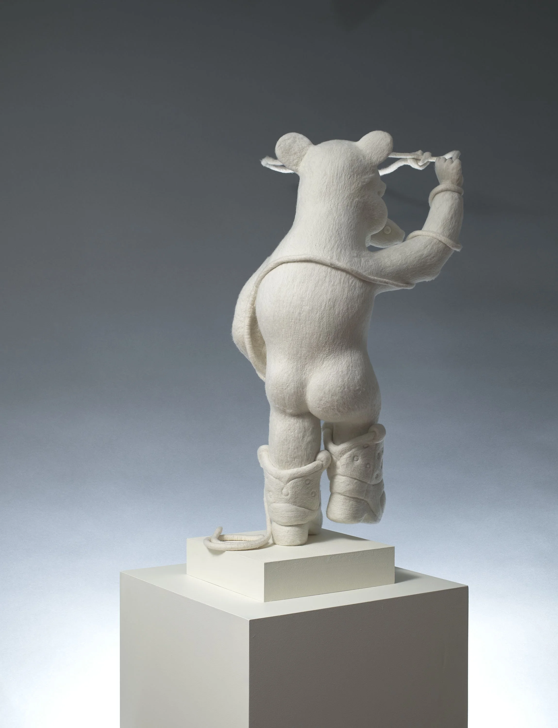 Laboriously transforming needle felted wool into richly animated sculptures, Latislaw presents us with the denizens of this mind-game: a drunken ‘come-hither’ horse with twisting legs; a bear, a goose, and a rabbit dragging a captive chicken caught in a dramatic bar fight; and a tangle of rabbits chasing bottles and each other (a euphemism for inebriation) animate Latislaw’s narratives with camp, queerness and irreverence.