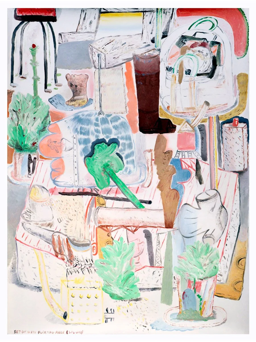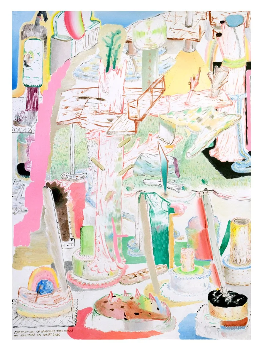Inspired by filmmakers and artists such as David Lynch, Georg Baselitz, Alejandro Jorodowsky, Josephine Halvorson, Salman Toor and Philip Guston, Mantellassi works in an aesthetic fully his own; mixing comic book storytelling, surrealism and formalism into a distinct visual language. Echoing the multi-perspective quality of comic book pages and surrealist art in his drawings, overlapping storylines and viewpoints cohabitate in one plane. Nonsensical alignments of objects and narratives intermingle with a humorous, dreamy palette of color, often paired with poetically off-kilter titles in his second language, English. Pastries (real and fake), trees, pipes, body parts, treehouses, scenes from the kitchen, shoes and trash from the woods all expand and contract between resolution and dissolution, animating a dreamlike quality where highly vivid thoughts remain incomplete and half-formed. Mantellassi is drawn toward this “half-formed” state of being, taking delight in the humor of pathos. “The downcast and the pathetic interests me very much for its human feeling of being sad and funny at the same time.”