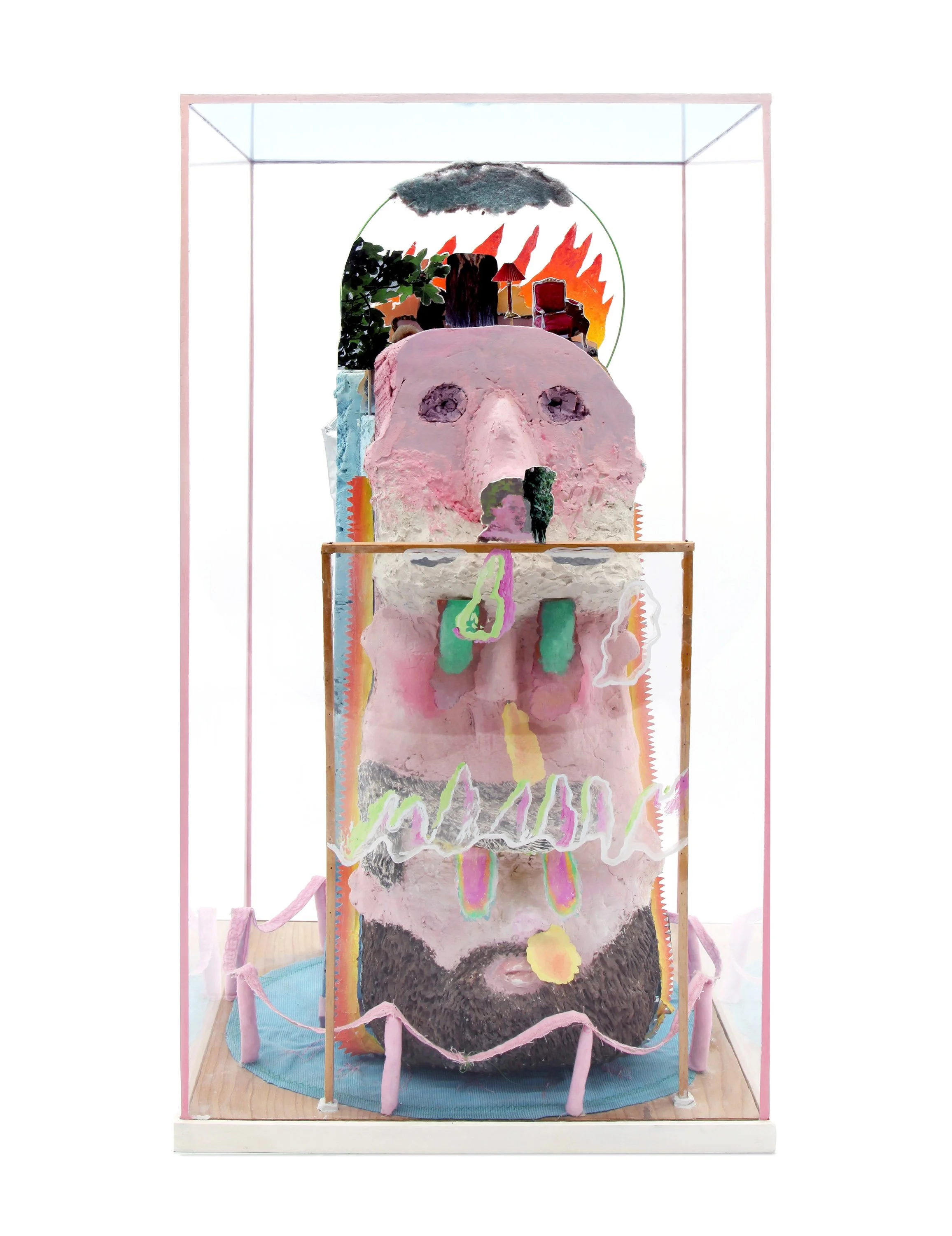 From certain drawings, Mantellassi creates three-dimensional sculptures—compact, diorama-like compositions composed of everyday materials in plexiglas casing. The humor and irony of his work is made concretely manifest in these objects, whose crumply, crude surfaces and “imperfect” finishes are precisely where the work culminates most fully; stage-sets for the tragicomedy of life where narrative and its artifice are on display at the same time. “As a stage set, from the audience you see something—the artifice works. But from backstage you see how everything is propped up, and just barely. Like kids putting on a show. I like seeing both perspectives at the same time. With the sculptures, it is like the drawings open up and I can see behind them and see what is holding them together.” For Mantellassi, this unfiltered humor in the artifice—life as a threadbare stageset—is the best release for the strangeness of everyday life. By delighting in the absurd, much like a sage piddling in the garden, Mantellassi conjures and jests the philosophical, while sweeping the wings for the next show.